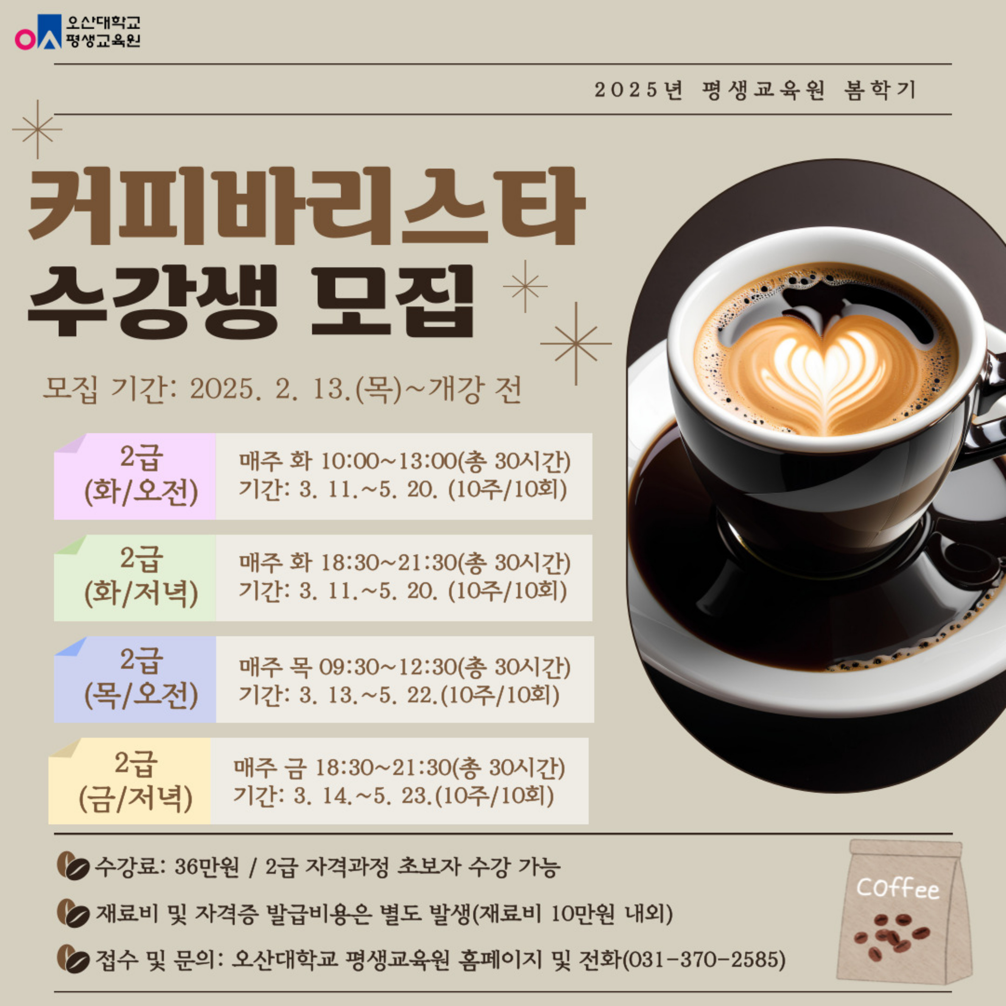 | 강의실 | 오산대학교 종합정보관 지하2층 A-B204(커피바리스타룸) | ||