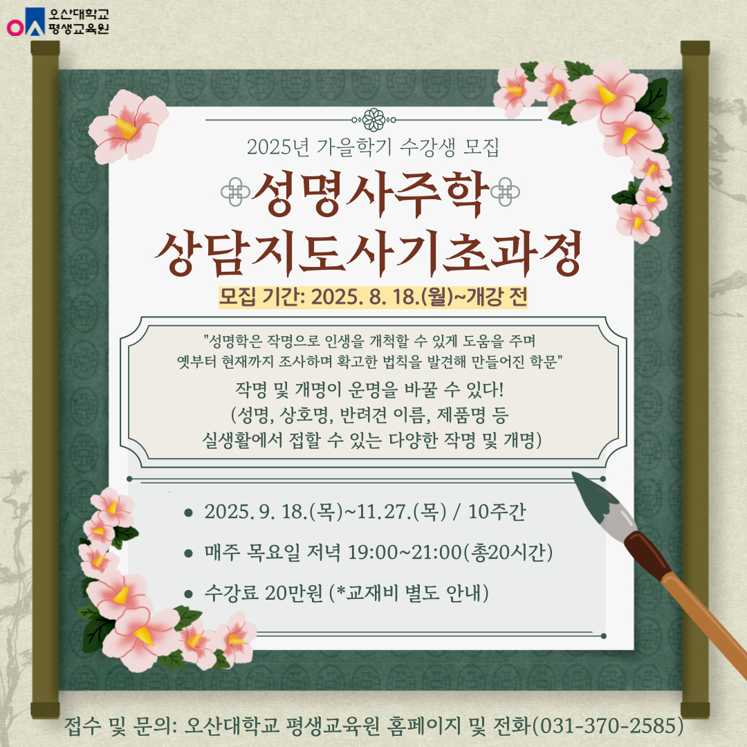 1주차 | 프로그램 운영 OT 및 준비물, 교재 안내 | - 프로그램 운영 OT 및 준비물, 교재 안내 - 성명사주학의 개요 및 기초이론 |